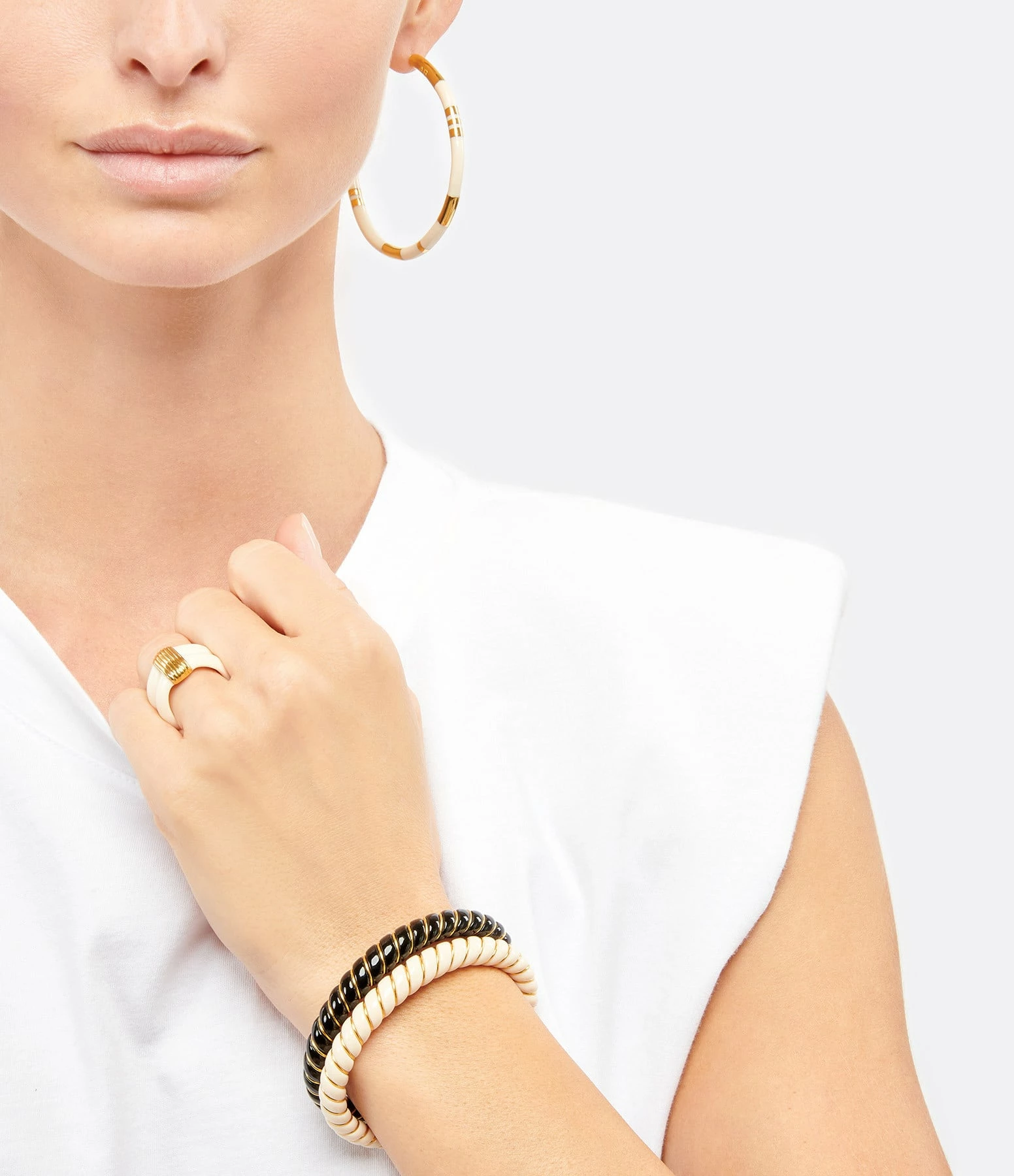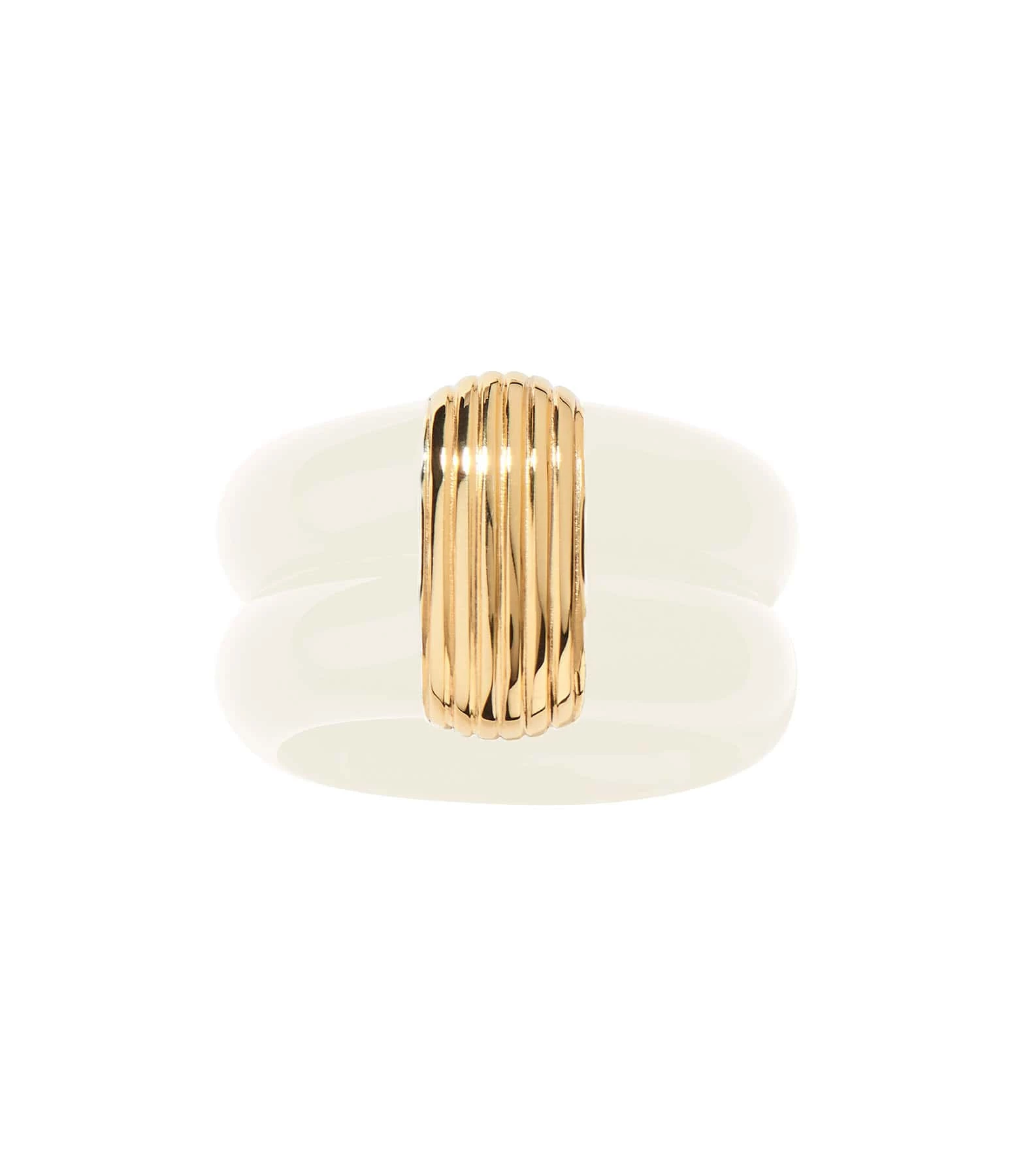Bague en résine blanche recouverte d’un détail strié plaqué en or.