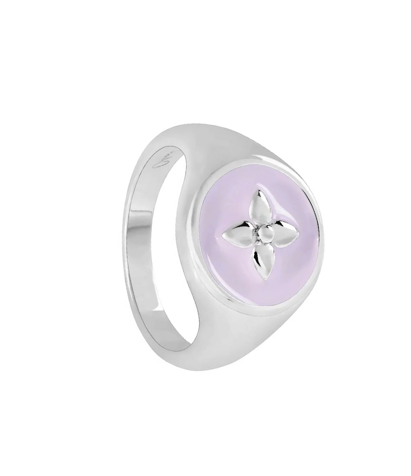 Chevalière ronde en argent et résine rose poudré avec symbole fleur “croisette de printemps”.