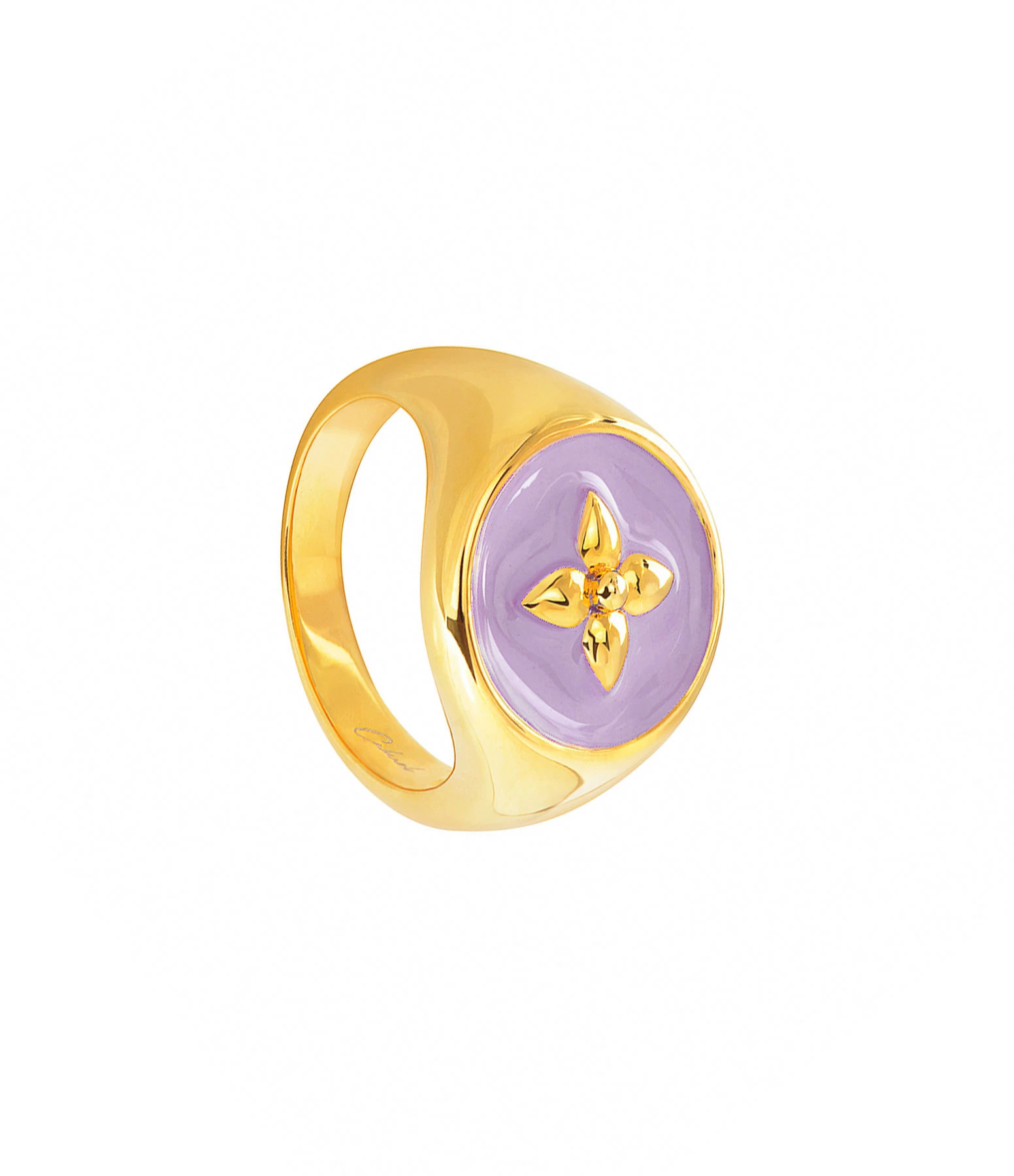 Chevalière ronde en vermeil et résine violette avec symbole fleur “croisette de printemps”.