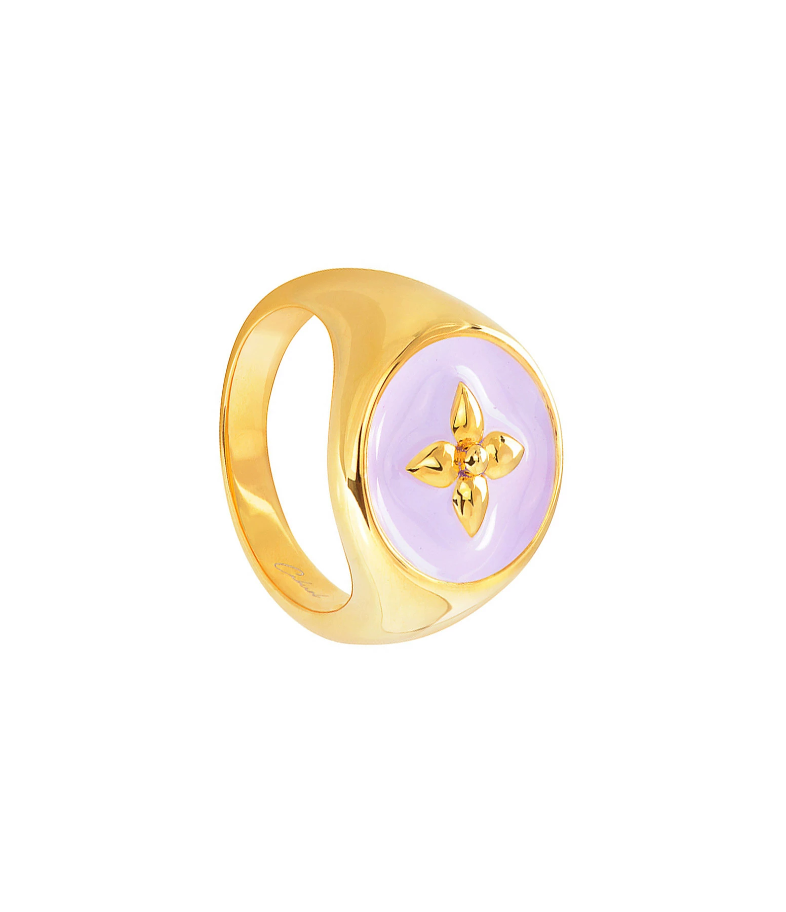 Chevalière ronde en vermeil et résine rose pâle avec symbole fleur “croisette de printemps”.