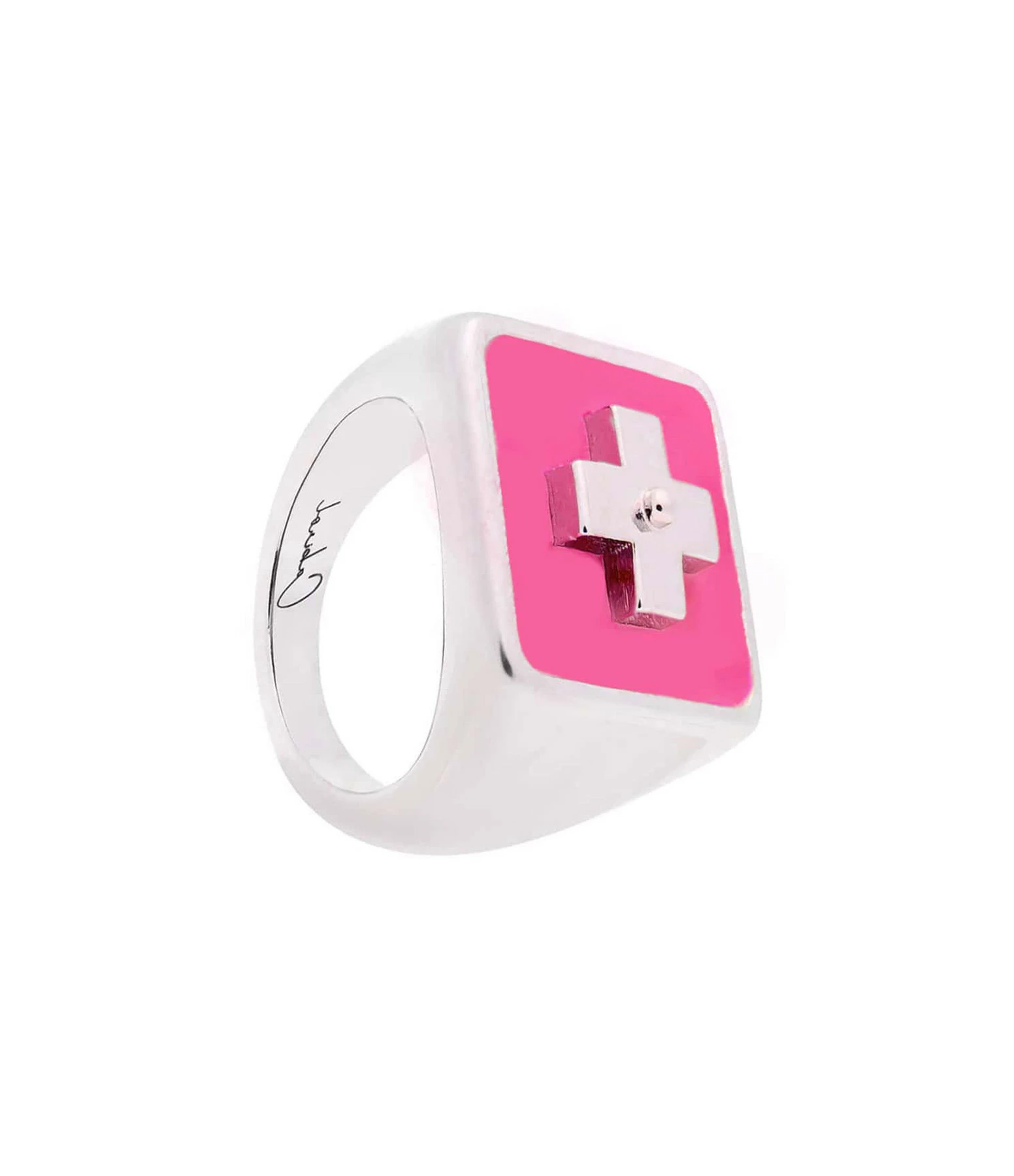 Chevalière carrée en argent et résine rose fluo avec symbole “+”.
