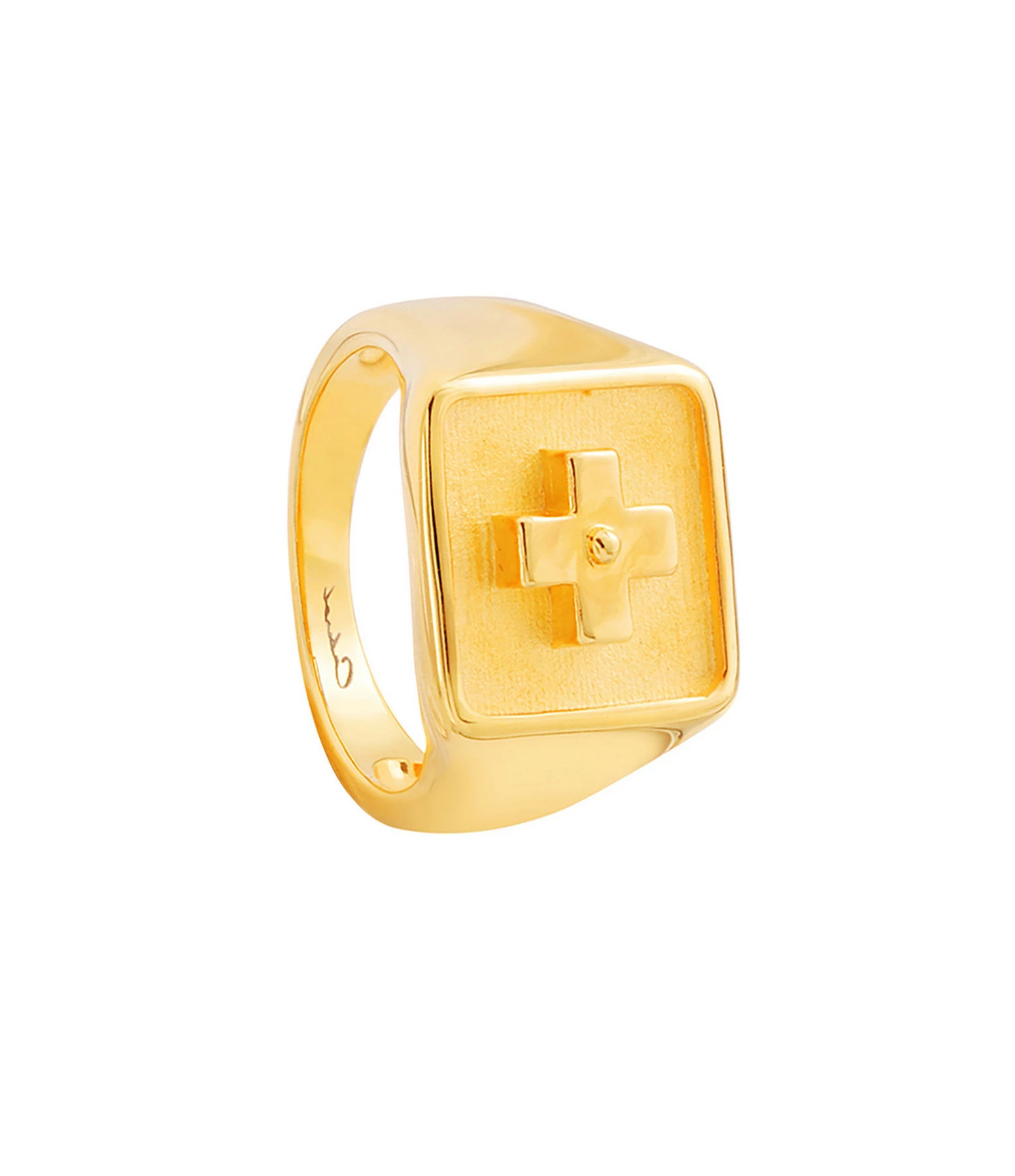 Chevalière carrée en vermeil avec symbole “+”.