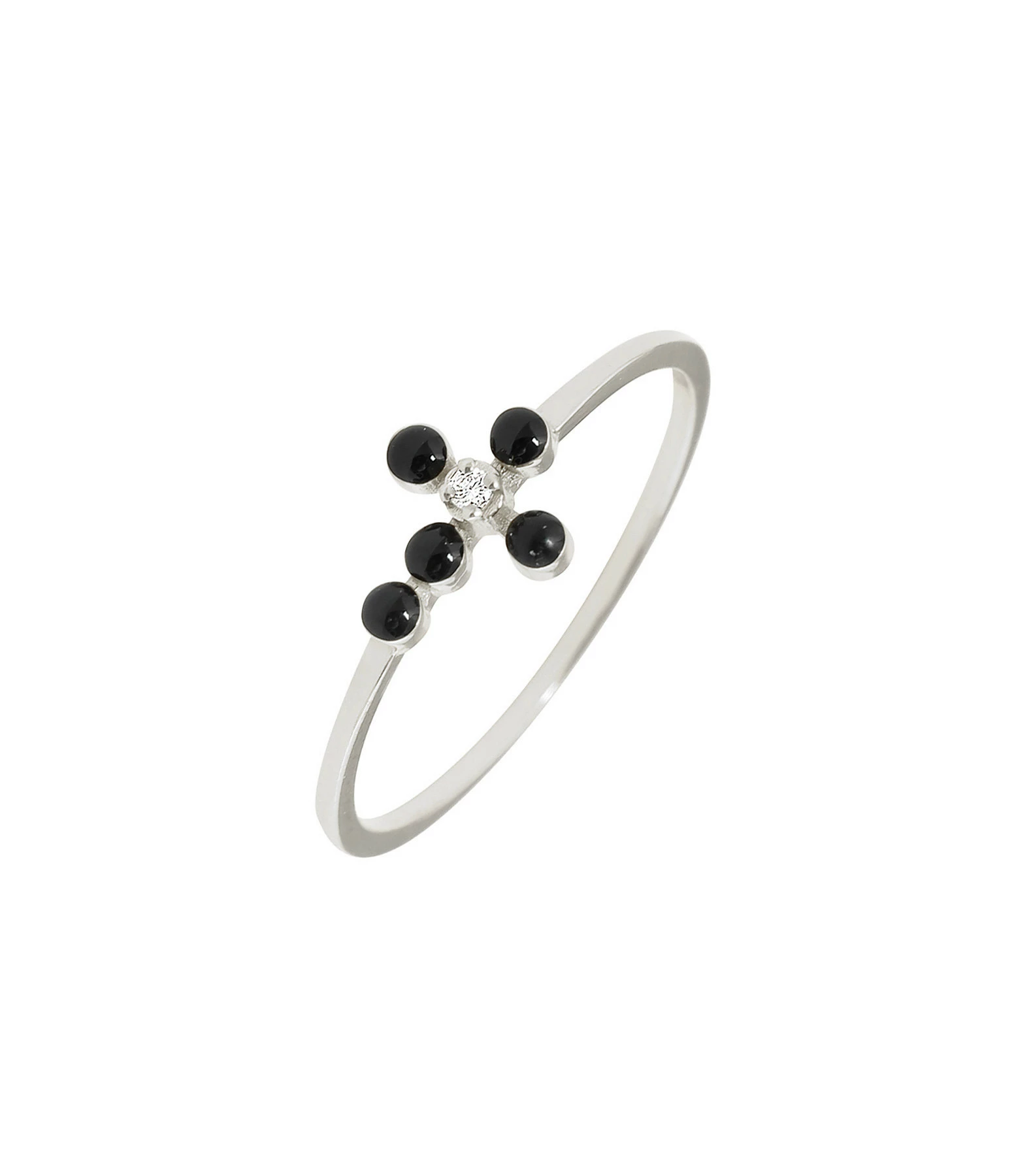 Bague fine en or blanc et résine, croix sertie d’un diamant blanc.