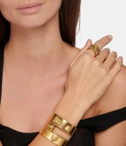 Bague en laiton trempé dans un bain d’or jaune 24 carats orné de cabochons en cristal de roche naturel. Logo gavé à l’intérieur de l’anneau.