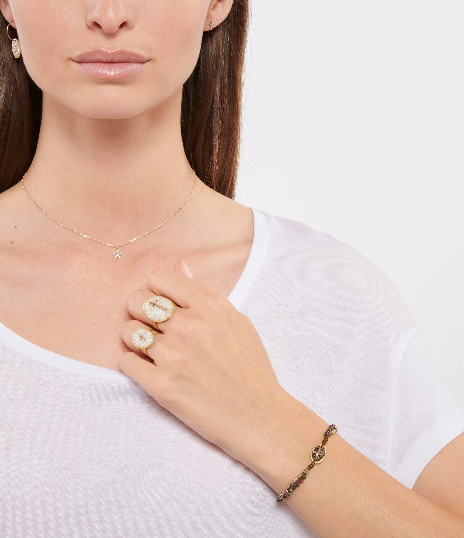 Bague ouverte en argent doré à l’or fin avec médaillon en nacre et émail pailleté. Ajustable.
