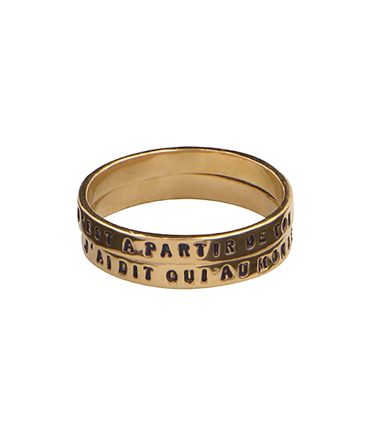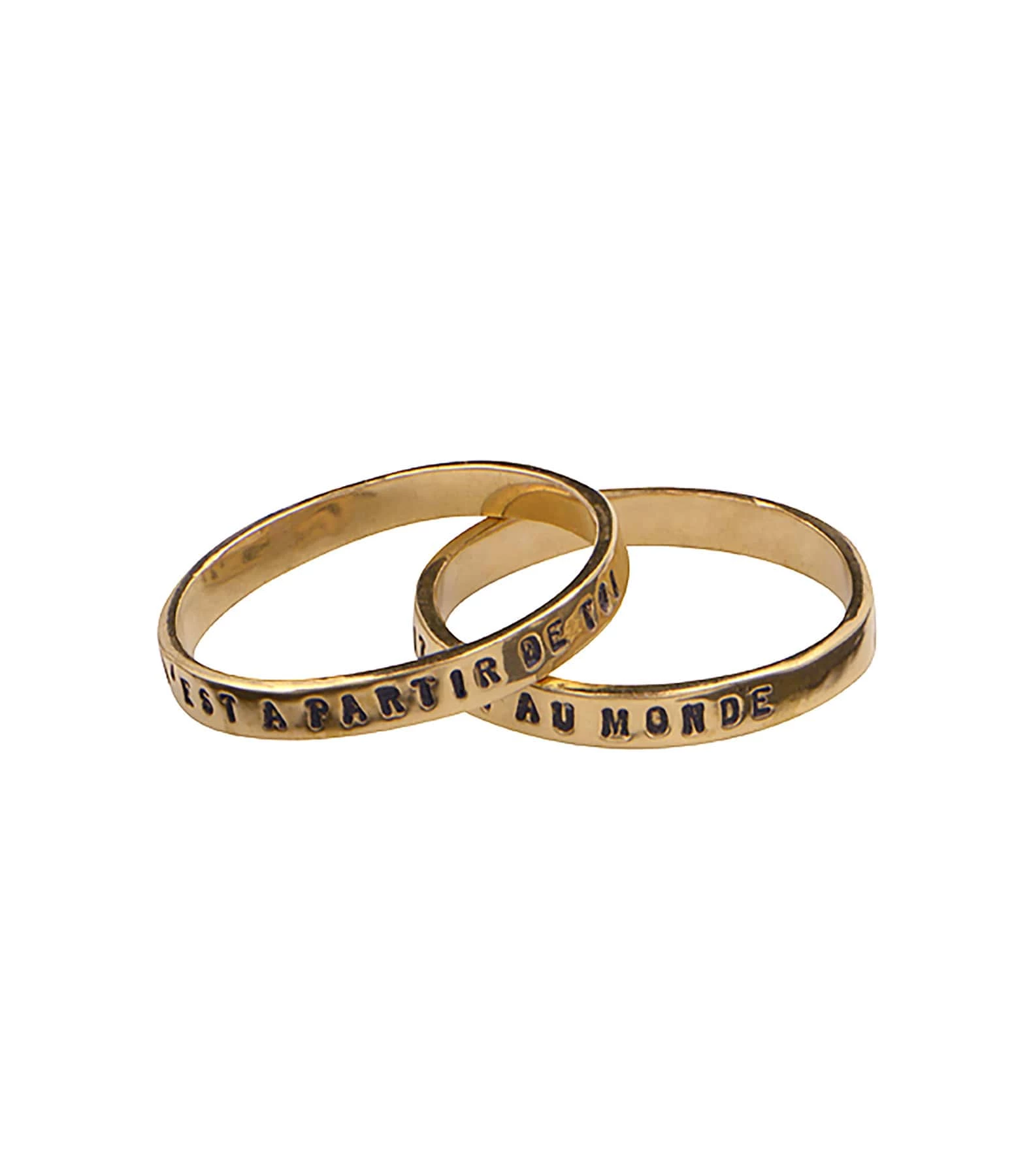 Deux bagues en vermeil avec gravure “C’EST A PARTIR DE TOI” et “QUE J’AI DIT OUI AU MONDE”.