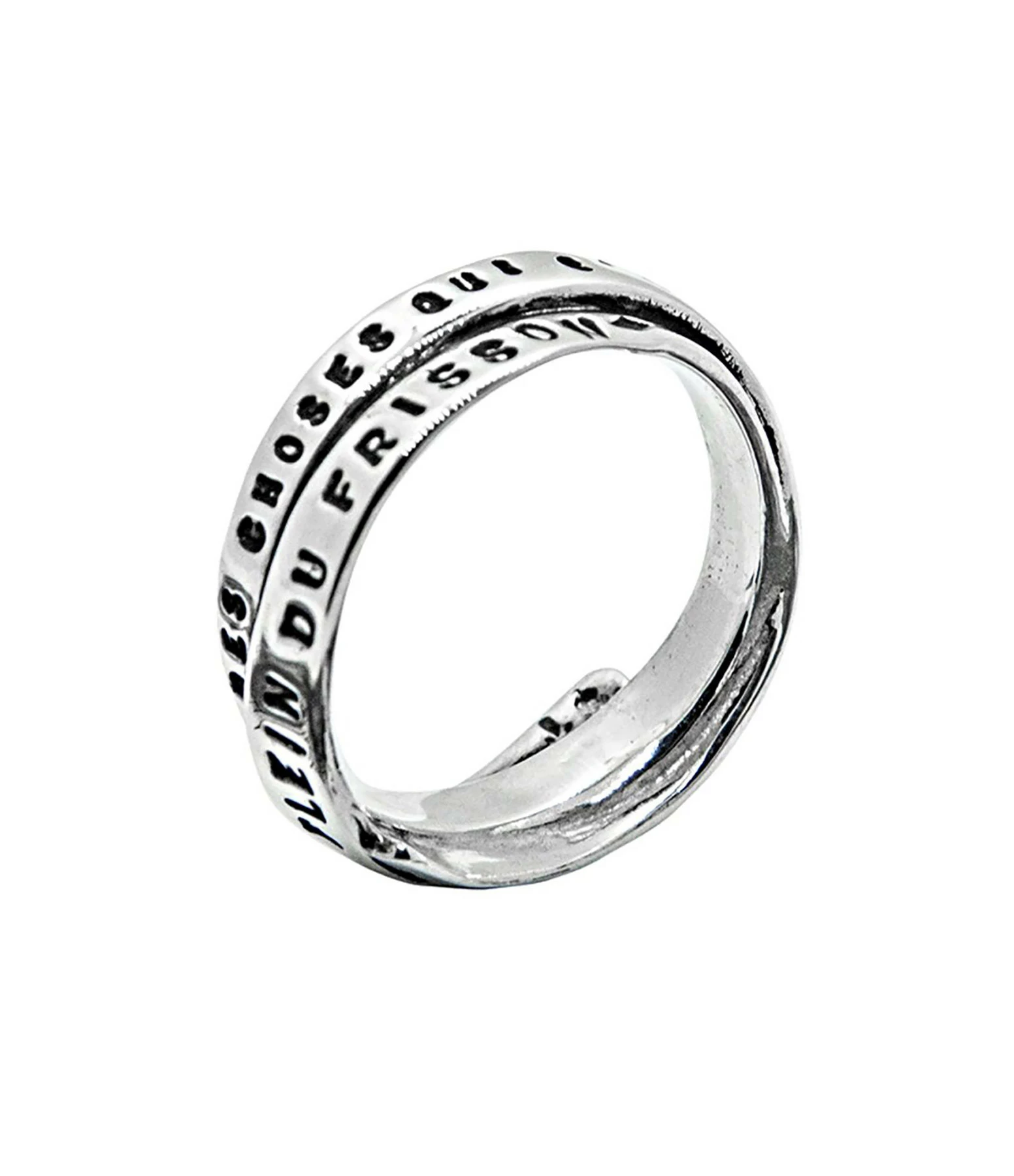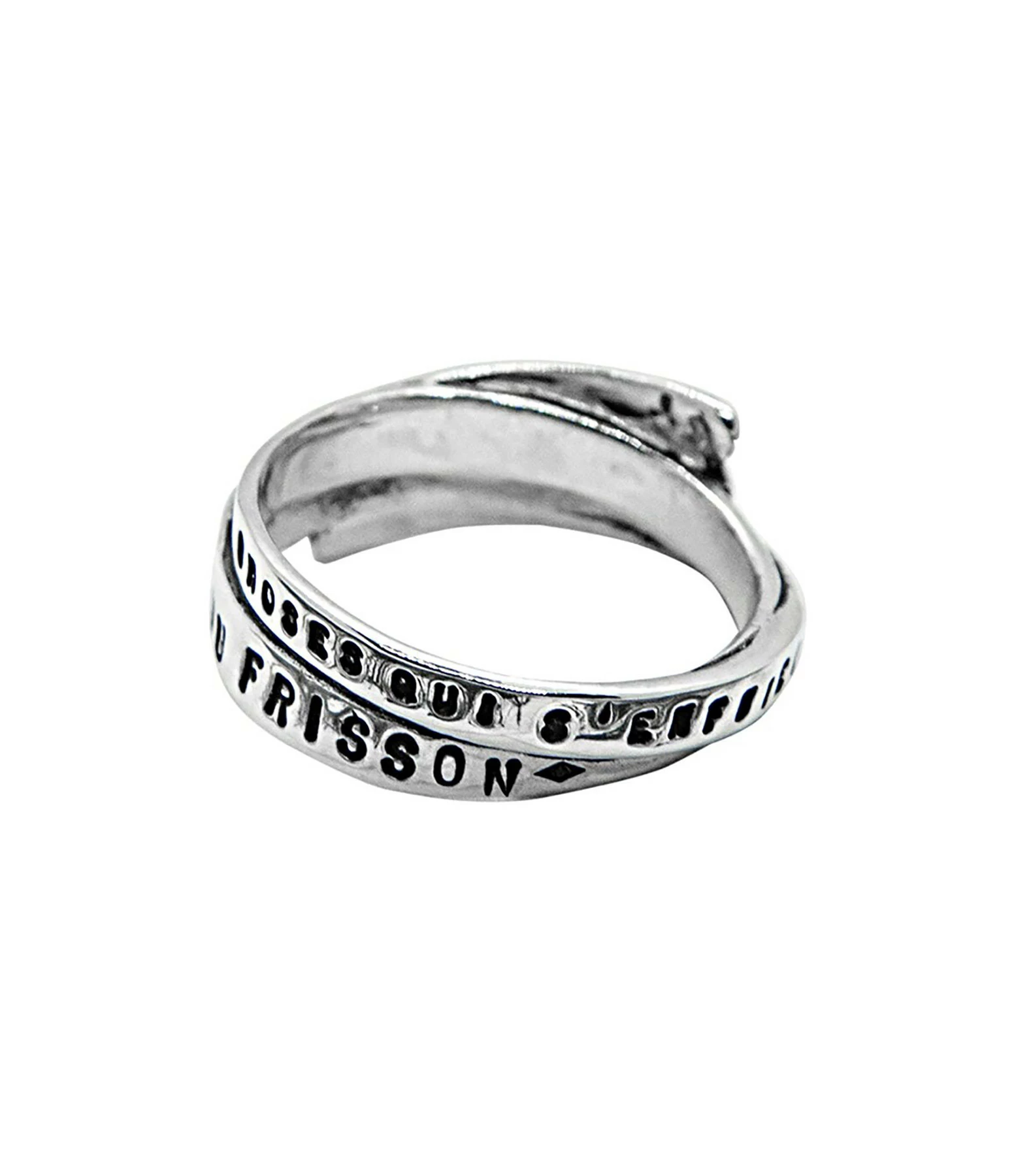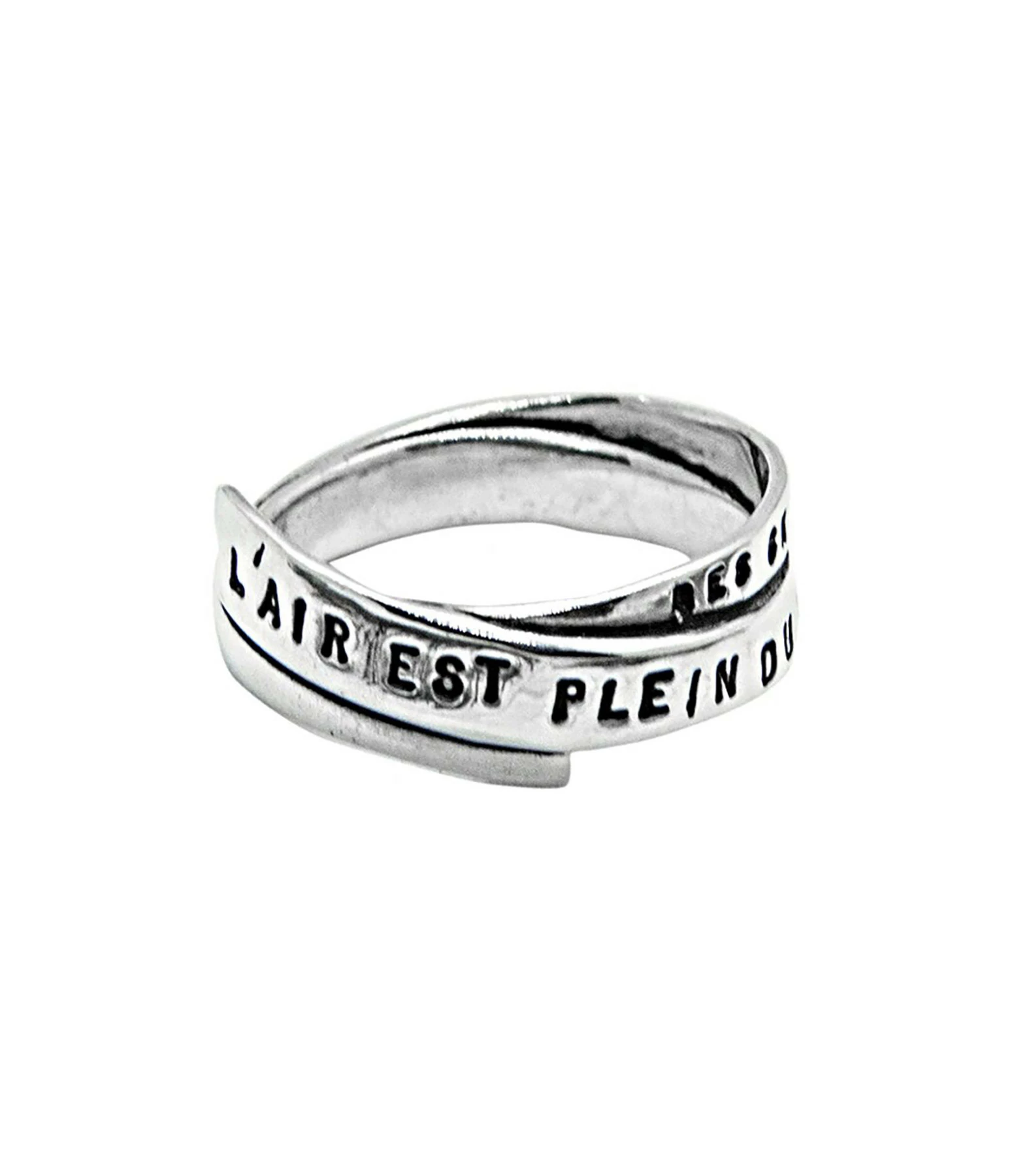 Bague à plusieurs tours en argent avec gravure “Des choses qui s’enfuient” et “L’air est plein du frisson”.