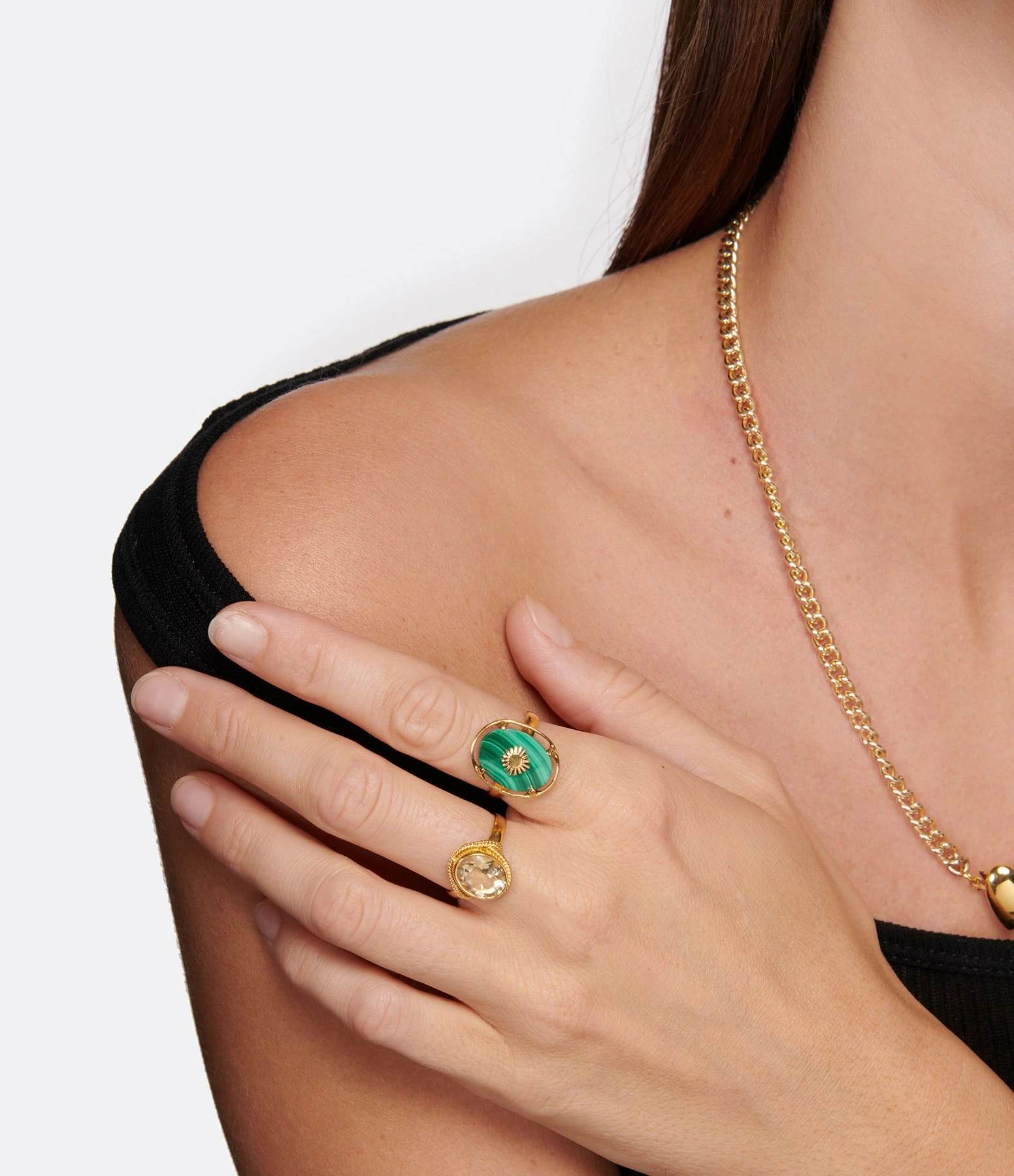 Bague en argent plaqué or avec une pierre citrine au centre.